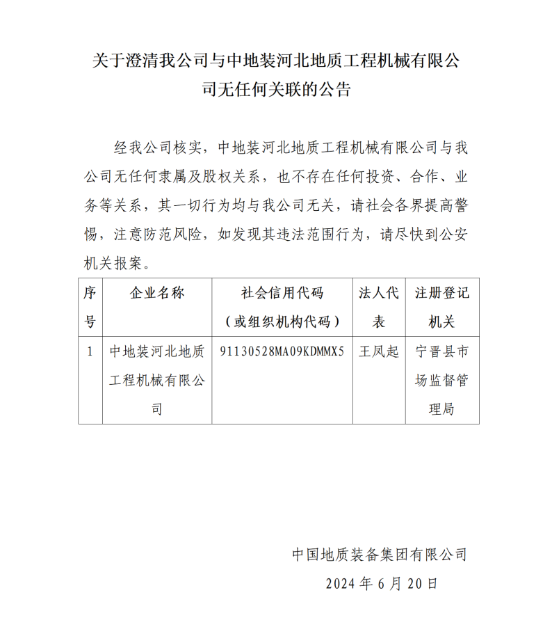 关于澄清我公司与中地装河北地质工程机械有限公司无任何关联的公告